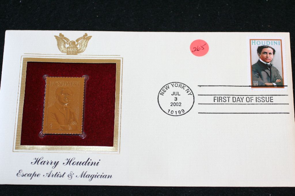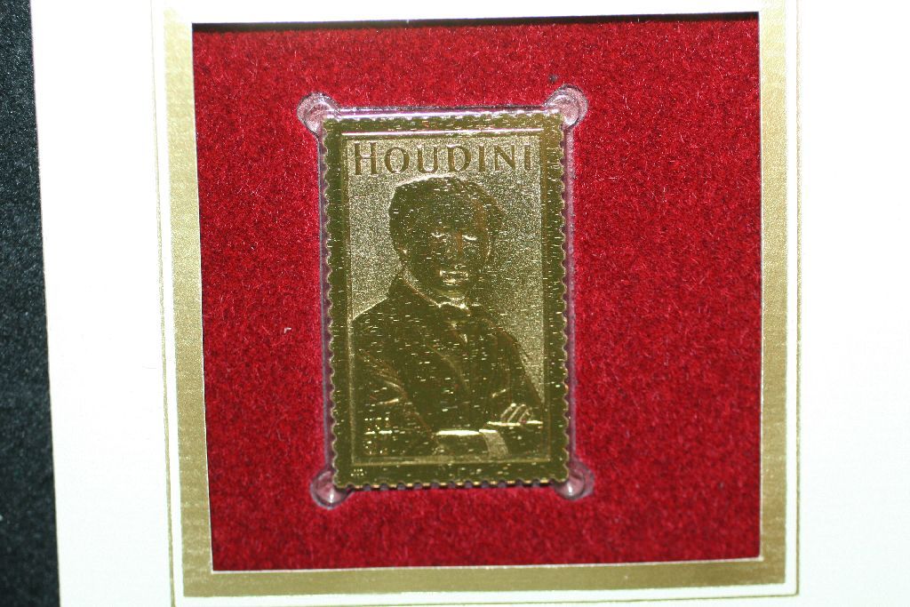2002 First Day of Issue 22K Gold Replica Stamp W/Postal Stamp; Harry Houdini Escape Artist & Magician