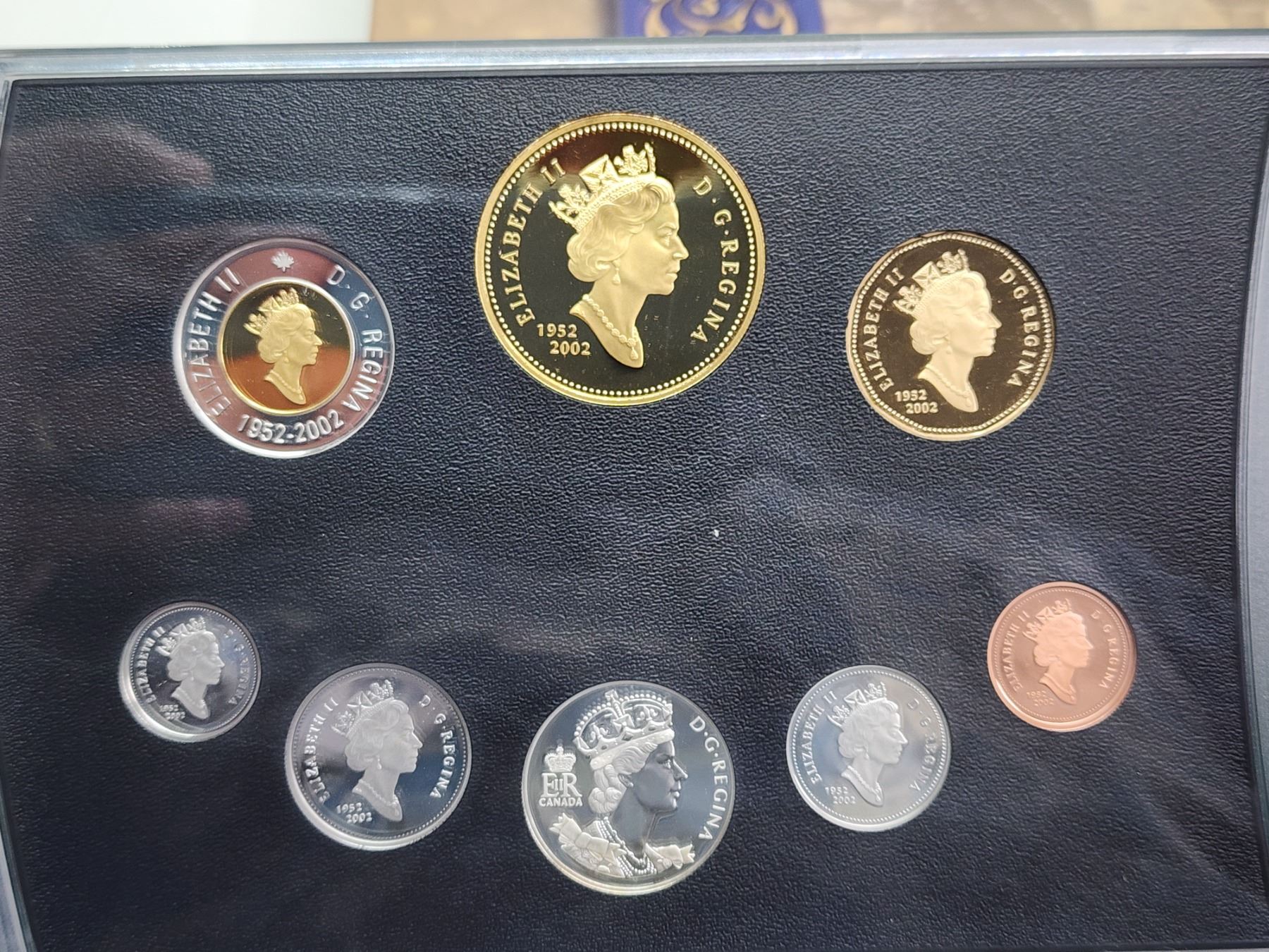 2002 Golden Jubilee Special Edition Proof Set. The Silver Dollar commemorates the Queen’s Golden Jubilee. Most coins are Sterling Silver. The Silver Dollar & Toonie are 24-karat Gold Plated. Housed in its original Royal Canadian Mint case & box of issue. Includes Certificate of Authenticity.