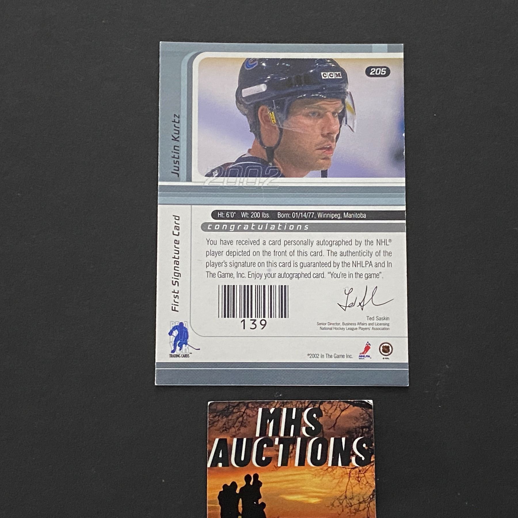 2002 IN THE GAME JUSTIN KURTZ AUTOGRAPH HOCKEY CARD