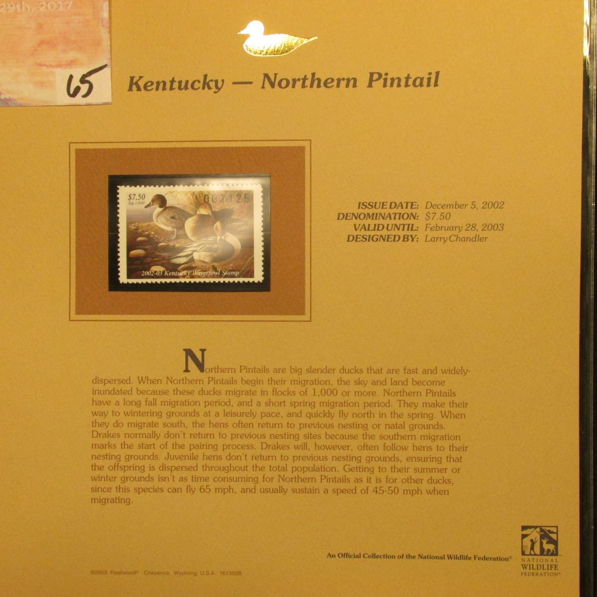 2002 Kentucky Waterfowl Stamp $7.50, Mint Condition in plastic sleeve with literature, unsigned. Depicts Northern Pintail.