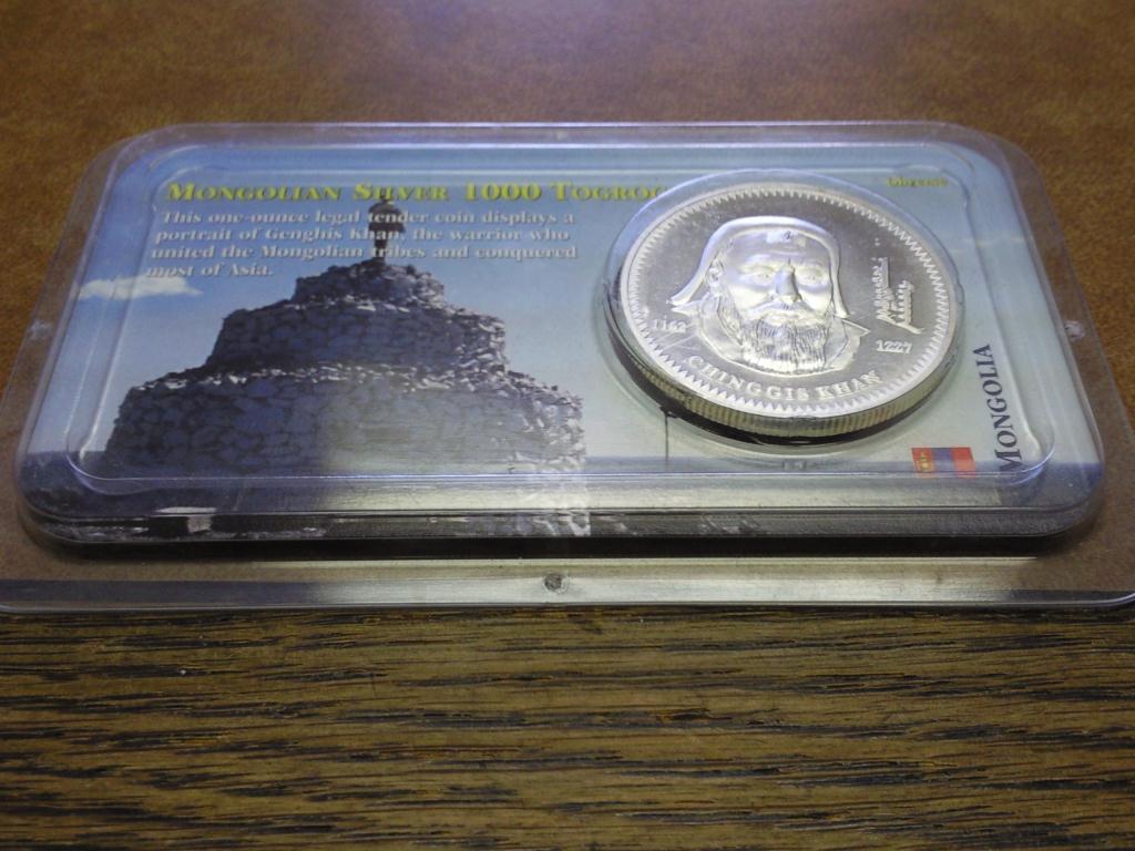 THIS ONE OUNCE LEGAL TENDER COIN DISPLAYS A PORTRAIT OF GENGHIS KHAN, STERLING SILVER