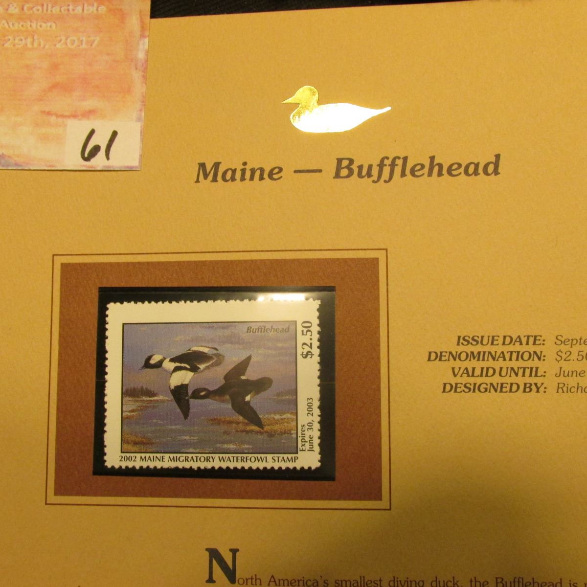 2002 Maine Waterfowl Stamp $2.50, Mint Condition in plastic sleeve with literature, unsigned. Depicts Bufflehead.
