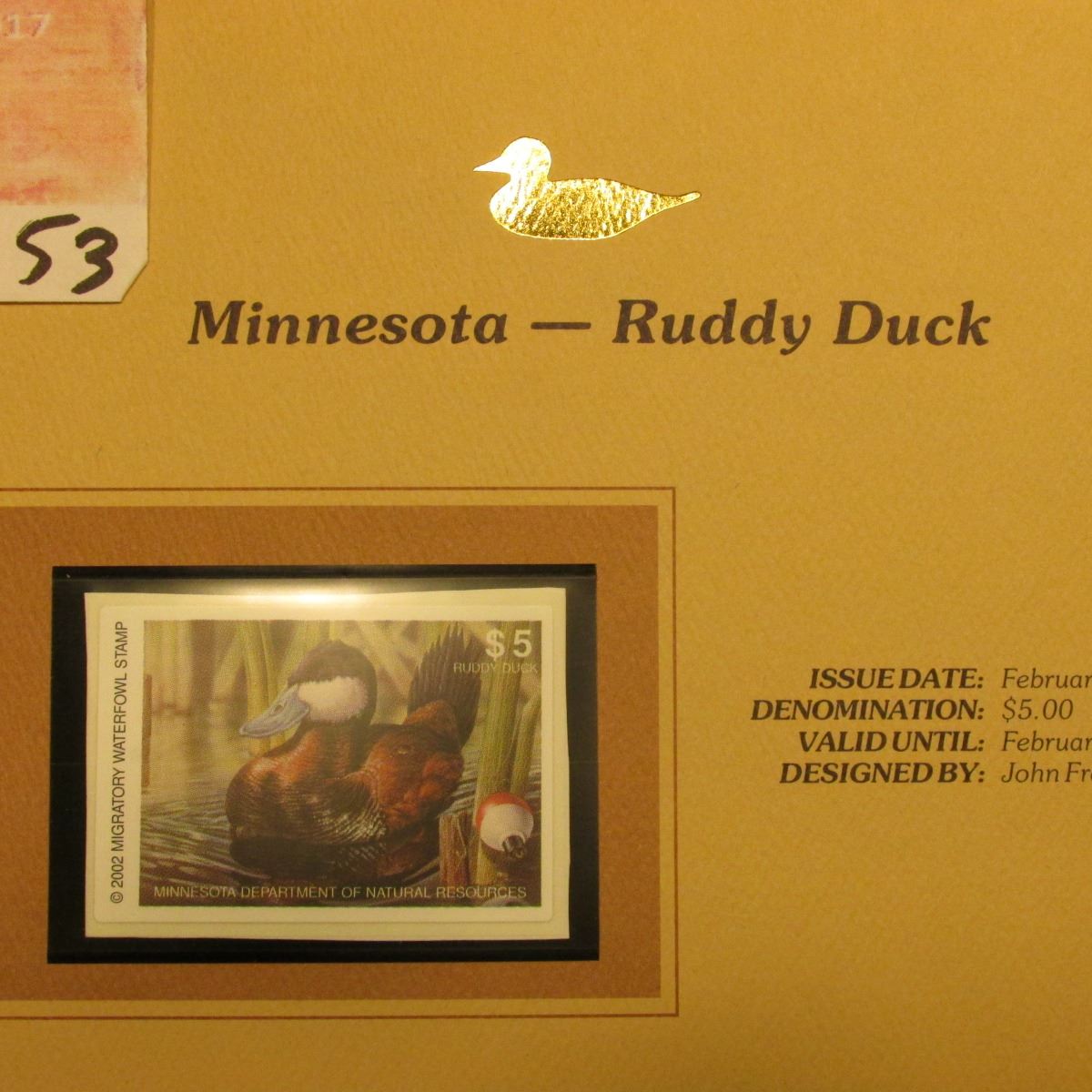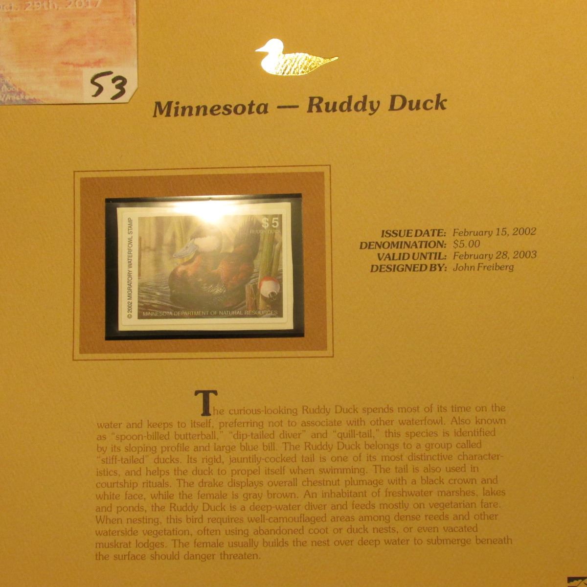 2002 Minnesota Waterfowl Stamp $5.00, Mint Condition in plastic sleeve with literature, unsigned. Depicts Ruddy Duck.