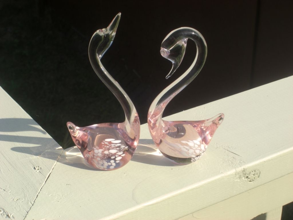 2002 - Murano Swans (pair) Stylized swans in pink glass with white interior flecks. Approx. 6”. Unmarked. By Murano artist Cenedese.with white interior flecks. Approx. 6”. Unmarked. By Murano artist Cenedese.