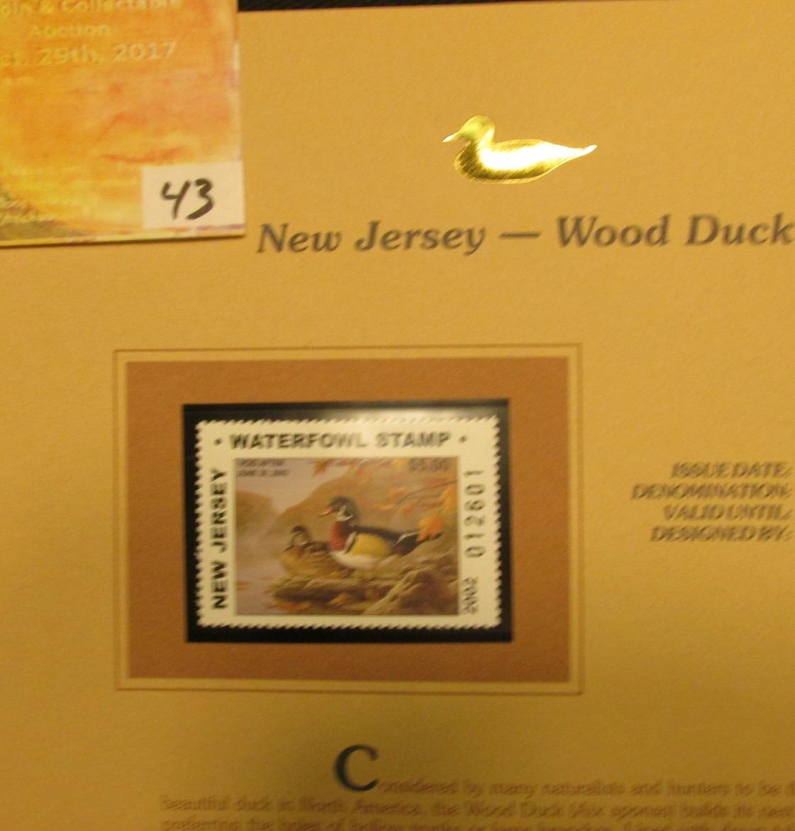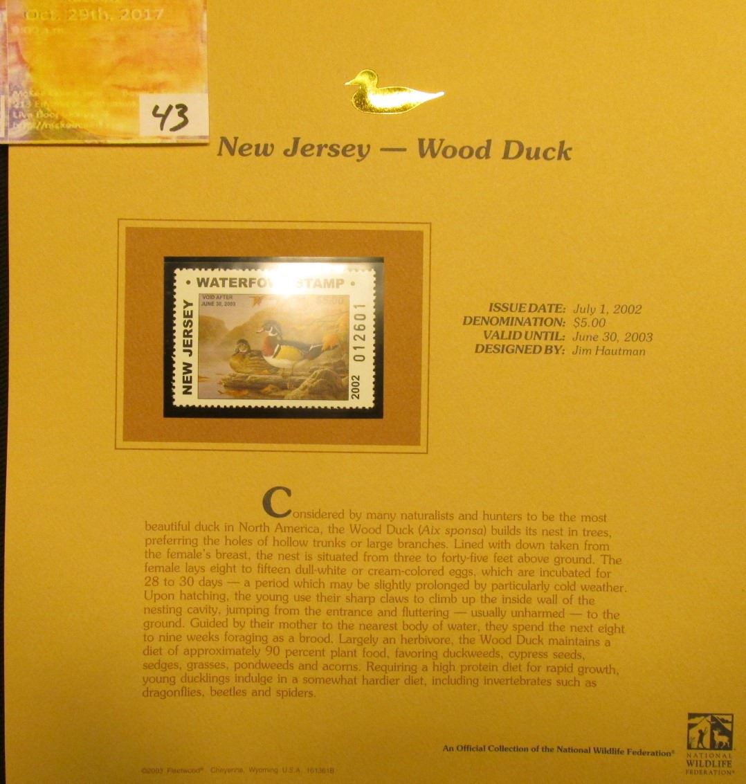 2002 New Jersey Waterfowl Stamp $5.00, Mint Condition in plastic sleeve with literature, unsigned. Depicts Wood Duck