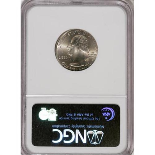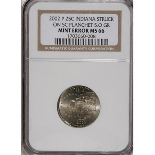 <B>2002-P 25C Indiana Statehood Quarter--Struck on a Five Cent Planchet--MS66 NGC.</B></I> 5.0 gm. The left-side rims are nearly complete, while the right-side legends show spreading toward the rim, where the undersized planchet was unable to fill the dies. Medium golden-brown toning visits the lustrous and carefully preserved surfaces.<BR><BR><b>Shipping:</b> Coins & Currency (<a target="_blank" href="http://www.heritageauctions.com/common/shipping.php">view shipping information</a>)