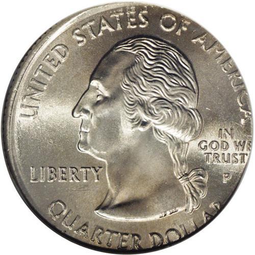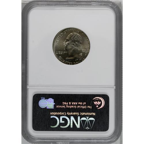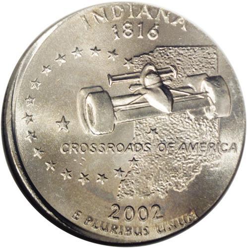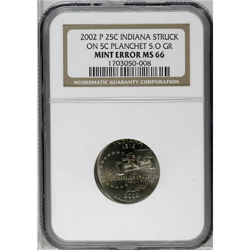 <B>2002-P<25C> Indiana Statehood Quarter--Struck on a Nickel Planchet--MS66 NGC.</B></I> 5.0 grams, standard for a nickel planchet. Only the peripheral lettering at the right side is affected by the reduced diameter of the nickel planchet. A fully lustrous and attractive Gem with wispy champagne toning over lustrous light gray surfaces.