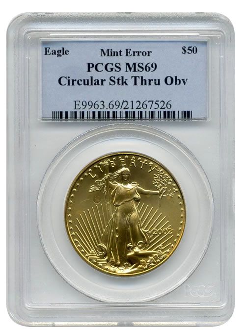 Up for your consideration is this UNIQUELY beautiful "Circular Struck thru Obverse" error 2002 PCGS MS-69 $50 1 ounce American Gold Eagle.