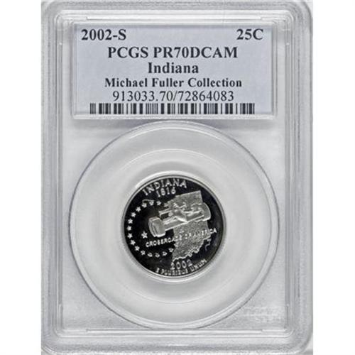 <B>2002-S 25C Indiana Clad PR70 Deep Cameo PCGS.</B></I> Michael Fuller Collection. PCGS Population (55/0). NGC Census: (0/0). Numismedia Wsl. Price for NGC/PCGS coin in PR70: $100. (#913033)<BR><BR><b>Shipping:</b> Coins & Currency (<a target="_blank" href="http://www.heritageauctions.com/common/shipping.php">view shipping information</a>)
