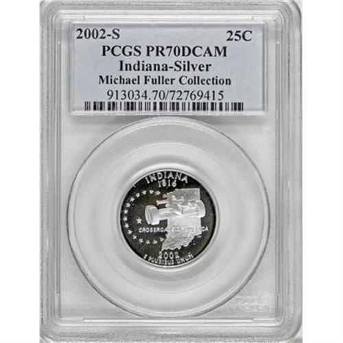 <B>2002-S 25C Indiana Silver PR70 Deep Cameo PCGS.</B></I> Michael Fuller Collection. PCGS Population (50/0). NGC Census: (0/0). Numismedia Wsl. Price for NGC/PCGS coin in PR70: $120. (#913034)<BR><BR><b>Shipping:</b> Coins & Currency (<a target="_blank" href="http://www.heritageauctions.com/common/shipping.php">view shipping information</a>)