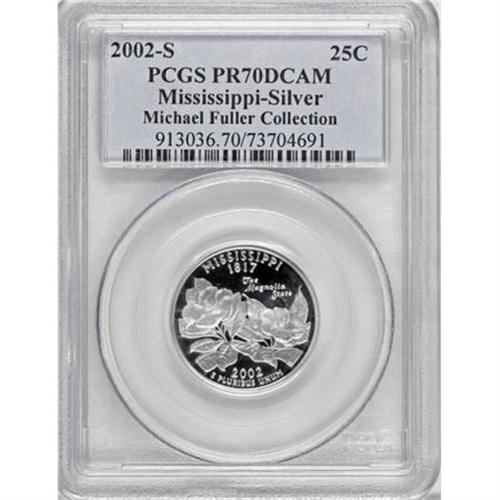 <B>2002-S 25C Mississippi Silver PR70 Deep Cameo PCGS.</B></I> Michael Fuller Collection. PCGS Population (73/0). NGC Census: (0/0). Numismedia Wsl. Price for NGC/PCGS coin in PR70: $70. (#913036)<BR><BR><b>Shipping:</b> Coins & Currency (<a target="_blank" href="http://www.heritageauctions.com/common/shipping.php">view shipping information</a>)