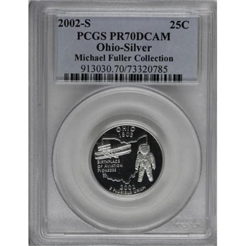 <B>2002-S 25C Ohio Silver PR70 Deep Cameo PCGS.</B></I> The Ohio Statehood quarter design emphasizes that state's connection to aviation, with depictions of the Wright's Kitty Hawk aircraft, and the image of an astronaut (presumably native son John Glenn). This example is flawlessly struck and impeccably preserved, with great field-to-device contrast observed between "black" fields and sharply frosted motifs. Population: 59 in 70 Deep Cameo (10/07). <BR><I>From The Michael Fuller Collection.</B></I><BR><BR><b>Shipping:</b> Coins & Currency (<a target="_blank" href="http://www.heritageauctions.com/common/shipping.php">view shipping information</a>)