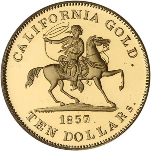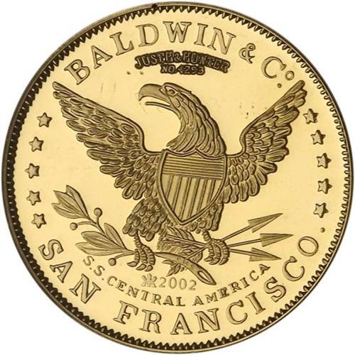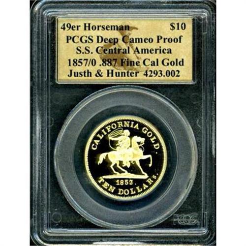 <b>(2002) S.S. Central America. 1857/0 $10. PCGS graded Deep Cameo Proof.887 Fine Cal Gold.</b> Made from melted down S. S. Central America gold, this interesting replica of the rare Baldwin and Company cowboy coin has the inscription Juste & Hunter No. 4293 on the reverse above the eagle. below the eagle, the date 2002 with S. S. CENTRAL AMERICA.