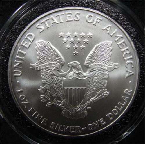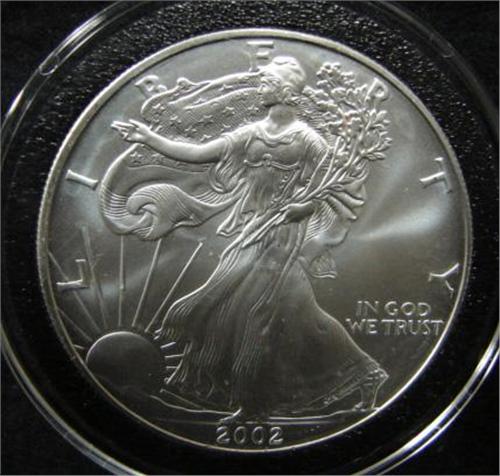 2002 AMERICAN EAGLE SILVER DOLLAR. Coin is in circular case.