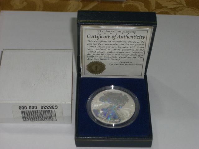 2002 SILVER EAGLE LIMITED MINTED *HOLOGRAM* SILVER EAGLE COMES IN ORIGINAL BOX/PACKAGE WITH CERTIFICATE OF AUTHENTICITY!! SILVER EAGLE CAME OUT OF SAFE BOX!! ***Coin, Currency & All Items Listed in this auction - Grades, Conditions and Values are not Safe Deposit Coins LLC Responsibilty. Grades, Condition and Values are determined by Consigner(s) & Buyers ONLY
