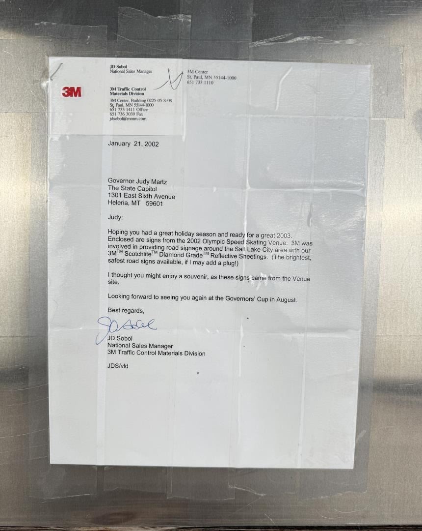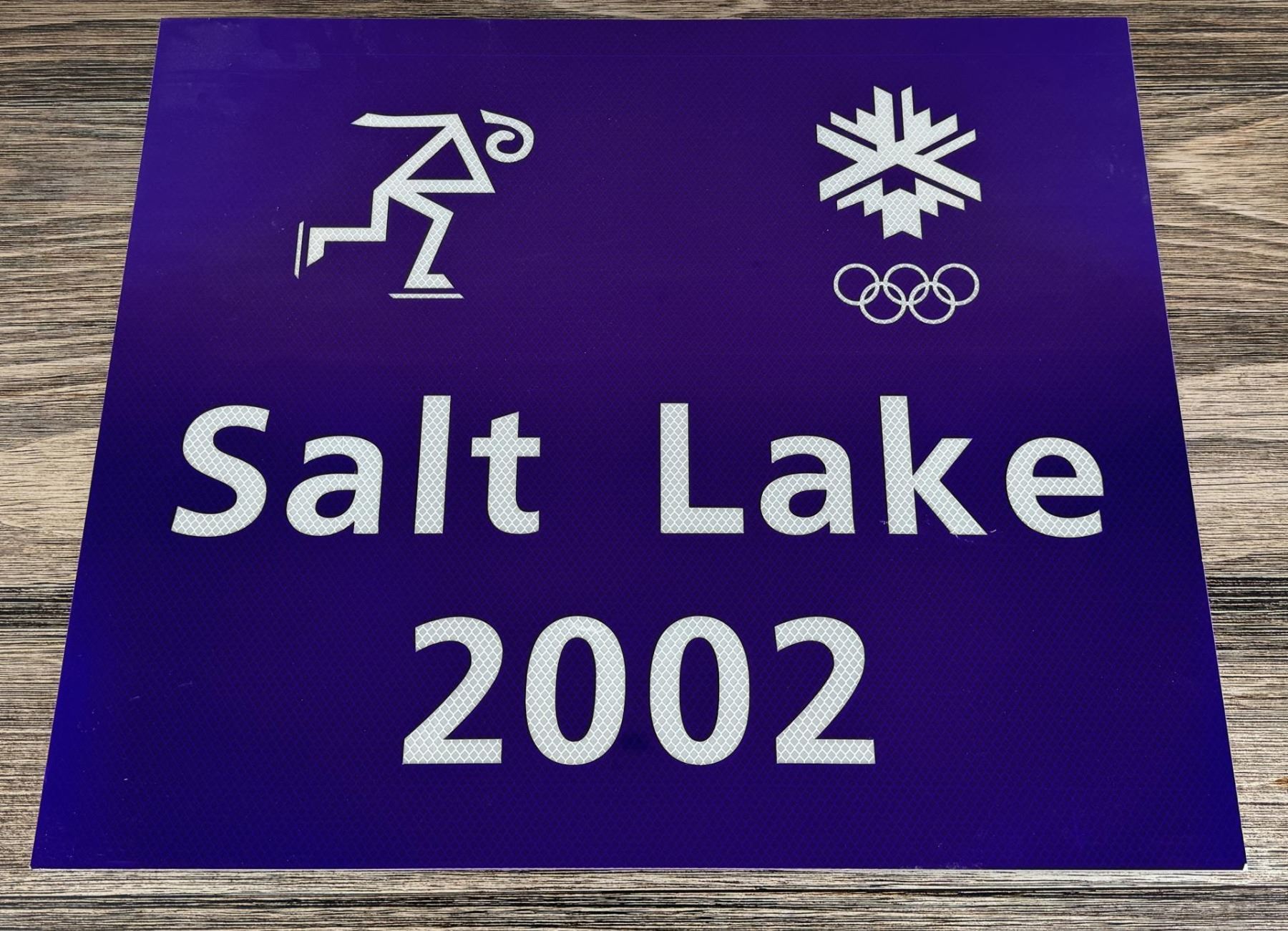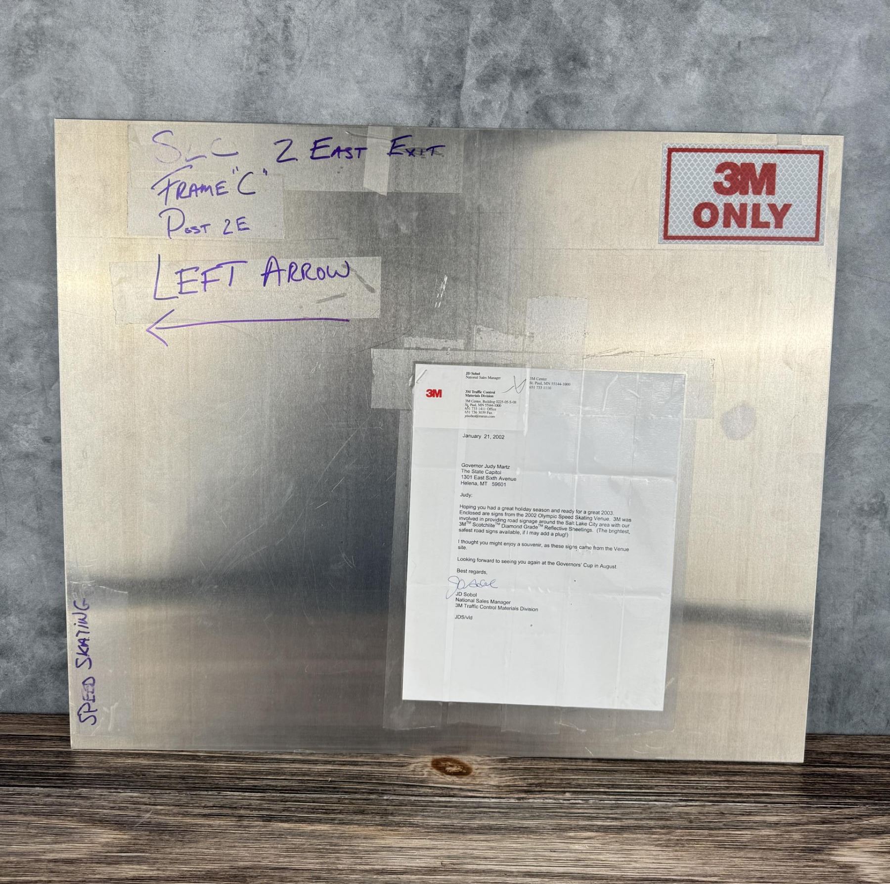 24 1/8" by 20 1/4". Original sign from the Speed Skating Venue. Given to Montana Governor Judy Martz by JD Sobol at 3M.