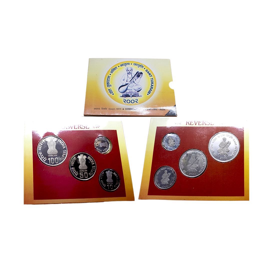 2002, Sant Tukaram, proof set of 4 coins, 100 rupees, 50 rupees, 10 rupees and 2 rupees, Kolkata min