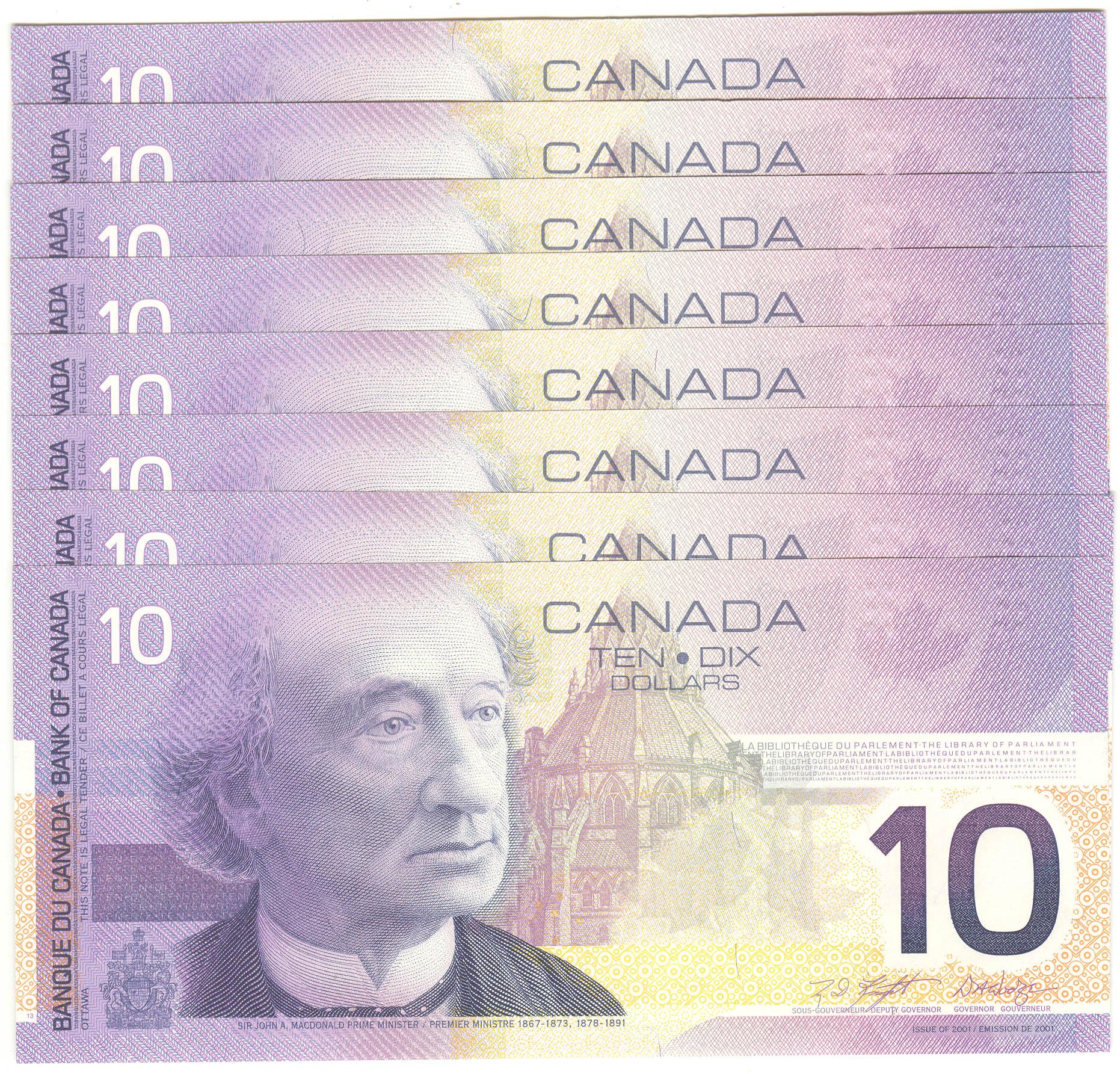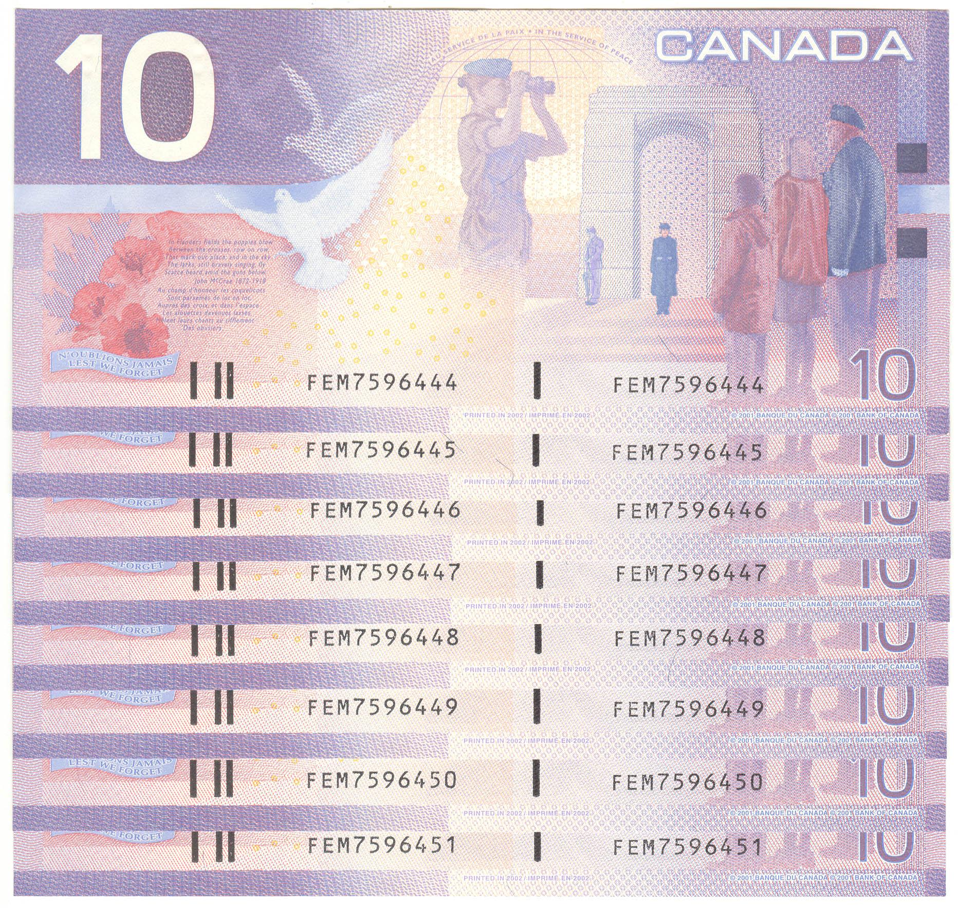 2002 Ten Dollars 8 Consecutive Replacement, BC-63bA, GEM UNC, Knight Dodge, serial FEM7596444-45-46-47-48-49-50-51, insert range 7.524M - 8.226M.