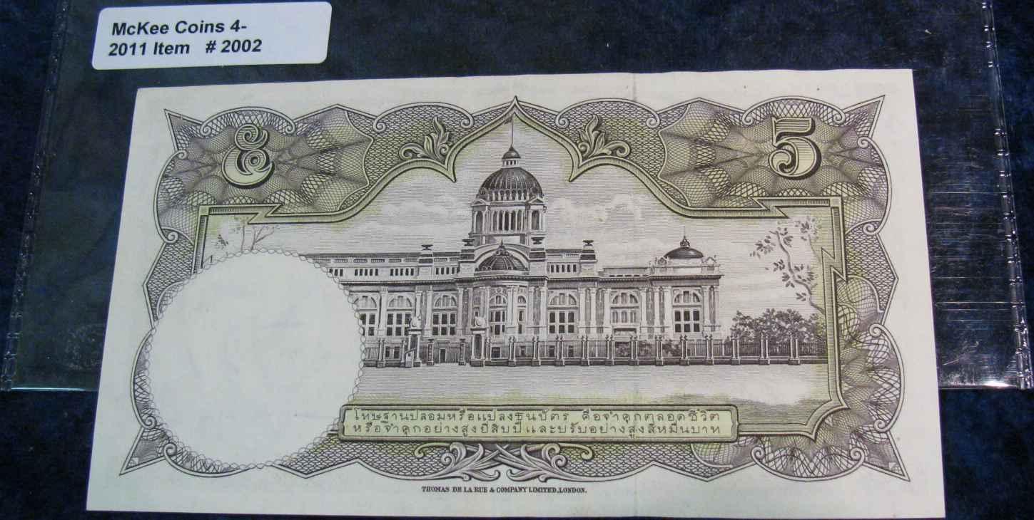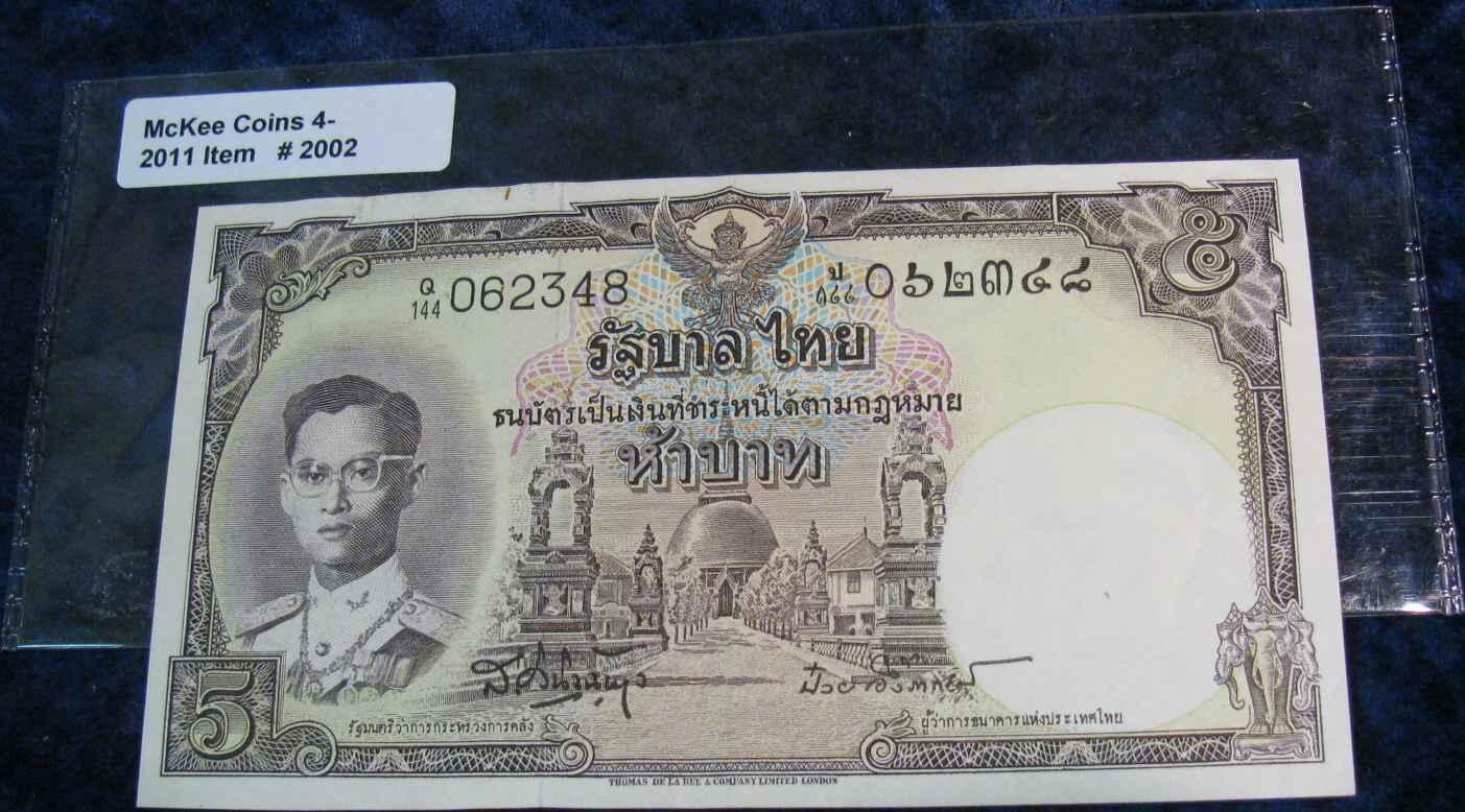 2002. Thailand Five Baht Bank note. Colorful with watermark. AU.