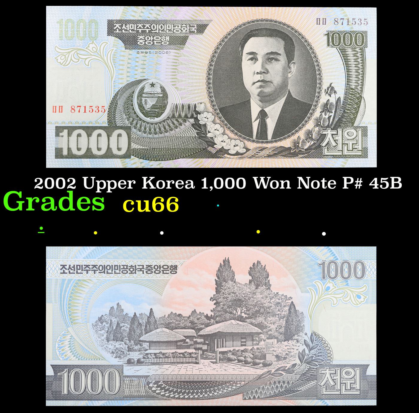 2002 Upper Korea 1,000 Won Note P# 45B Grades Gem+ CU