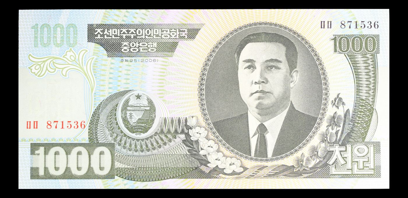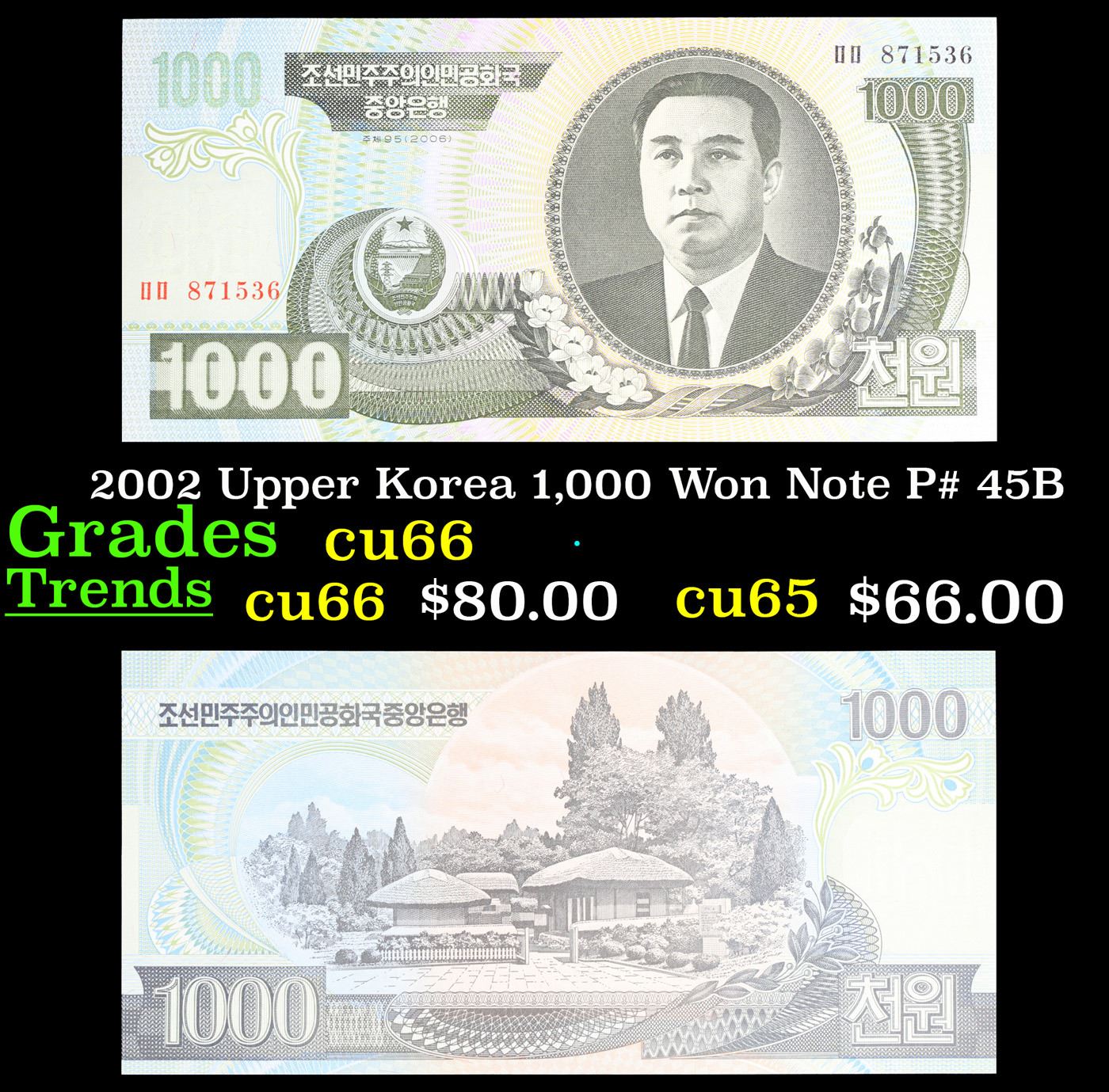 2002 Upper Korea 1,000 Won Note P# 45B Grades Gem+ CU.