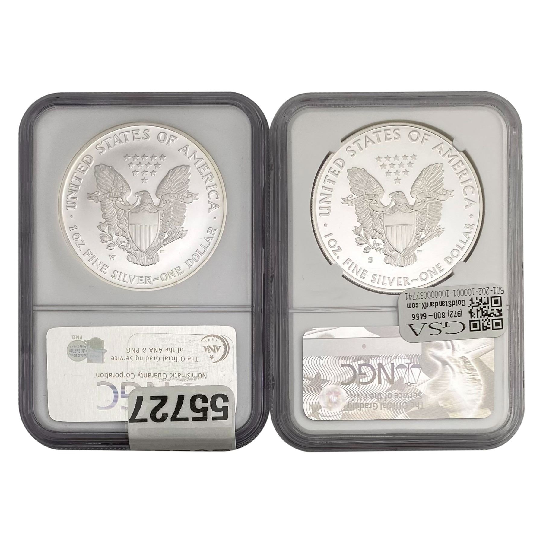 e. Coins sold referencing a third-party grading service are sold “AS IS” without any express or implied warranty, except for a guarantee by GSA that they are genuine. Removal or alteration of the holder, voids all of Bidder’s claims concerning that Product. Certain warranties may be available from the grading services and Bidders are referred to them for further details: Numismatic Guaranty Corporation (NGC), PO Box 4776, Sarasota, FL 34230, www.ngccoin.com/services/writtenguarantee.asp; Professional Coin Grading Services (PCGS), PO Box 9458, Newport Beach, CA 92658, www.pcgs.com/guarantee.html; ANACS, 6555 S. Kenton St., Ste. 303, Englewood, CO 80111; and Independent Coin Grading Co. (ICG), 7901 East Bellview, Ave., Suite 50, Englewood, CO 80111.