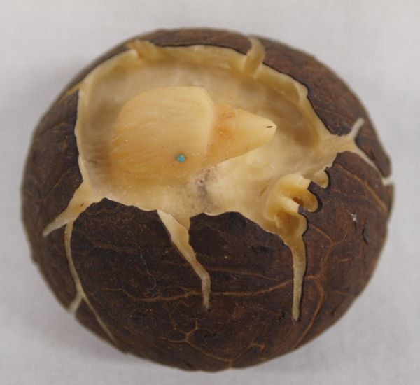 2002 Zuni Eagle in Egg Tagua Nut Fetish Derrick Kaamasee, measures 1.75'' x 2.25'', hallmarked on bottom and marked Zuni '02