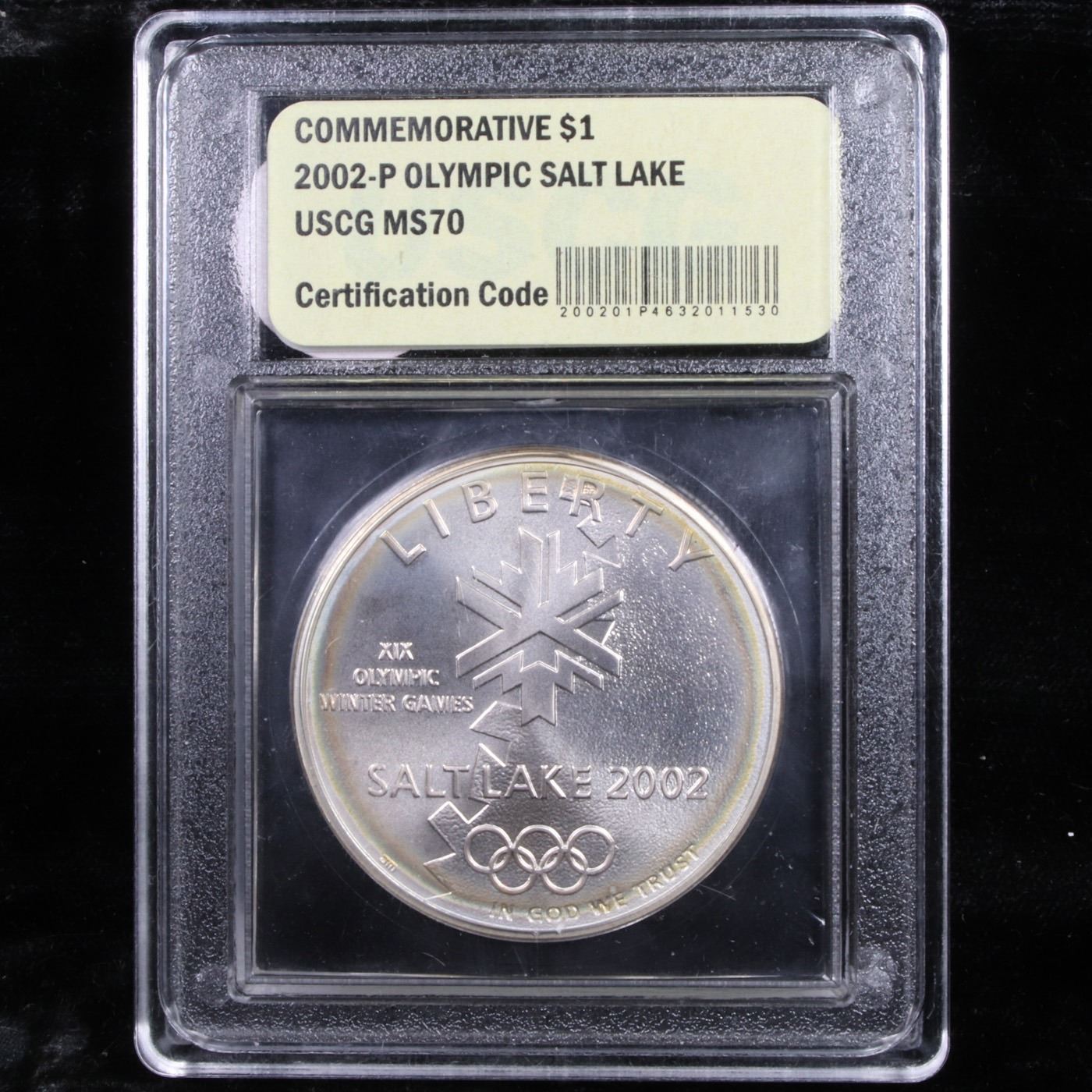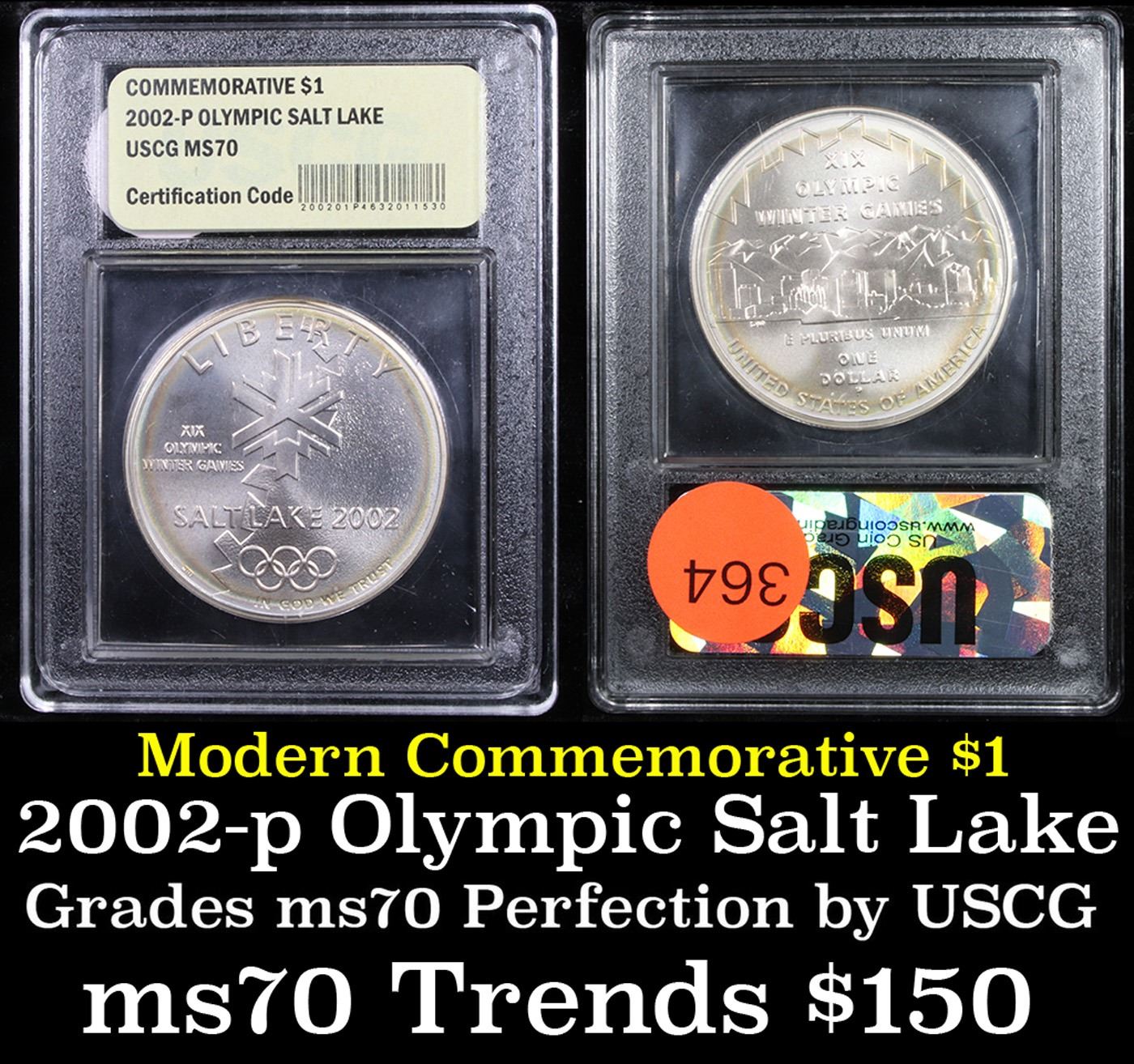 2002-p Olympic Salt Lake Modern Commem Dollar $1 Grades ms70, Perfection By USCG. 0 The 2002 Olympic Salt Lake City Silver Dollar was issued for the 2002 Winter Olympics held in Salt Lake City, Utah. This example is graded ms70 by USCG.