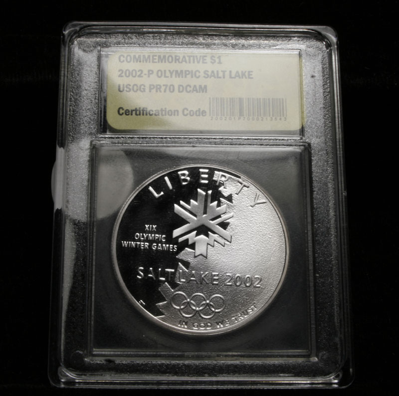 The 2002 Olympic Salt Lake City Silver Dollar was issued for the 2002 Winter Olympics held in Salt Lake City, Utah. PCGS lists PR70 DCAM at $850. This example is graded PR70 DCAM by USCG. Estimated Value $200
