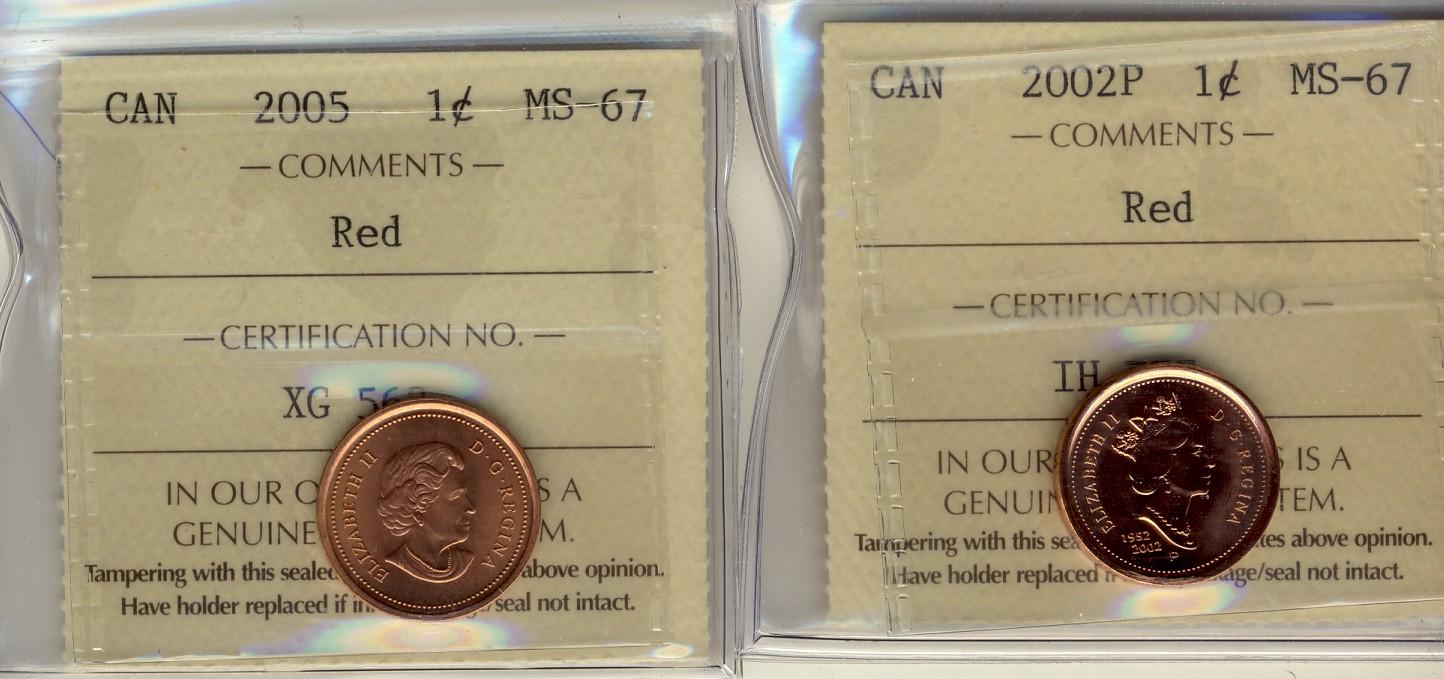2002P & 2005 1¢ ICCS MS67. Lot of 2 gem coins.