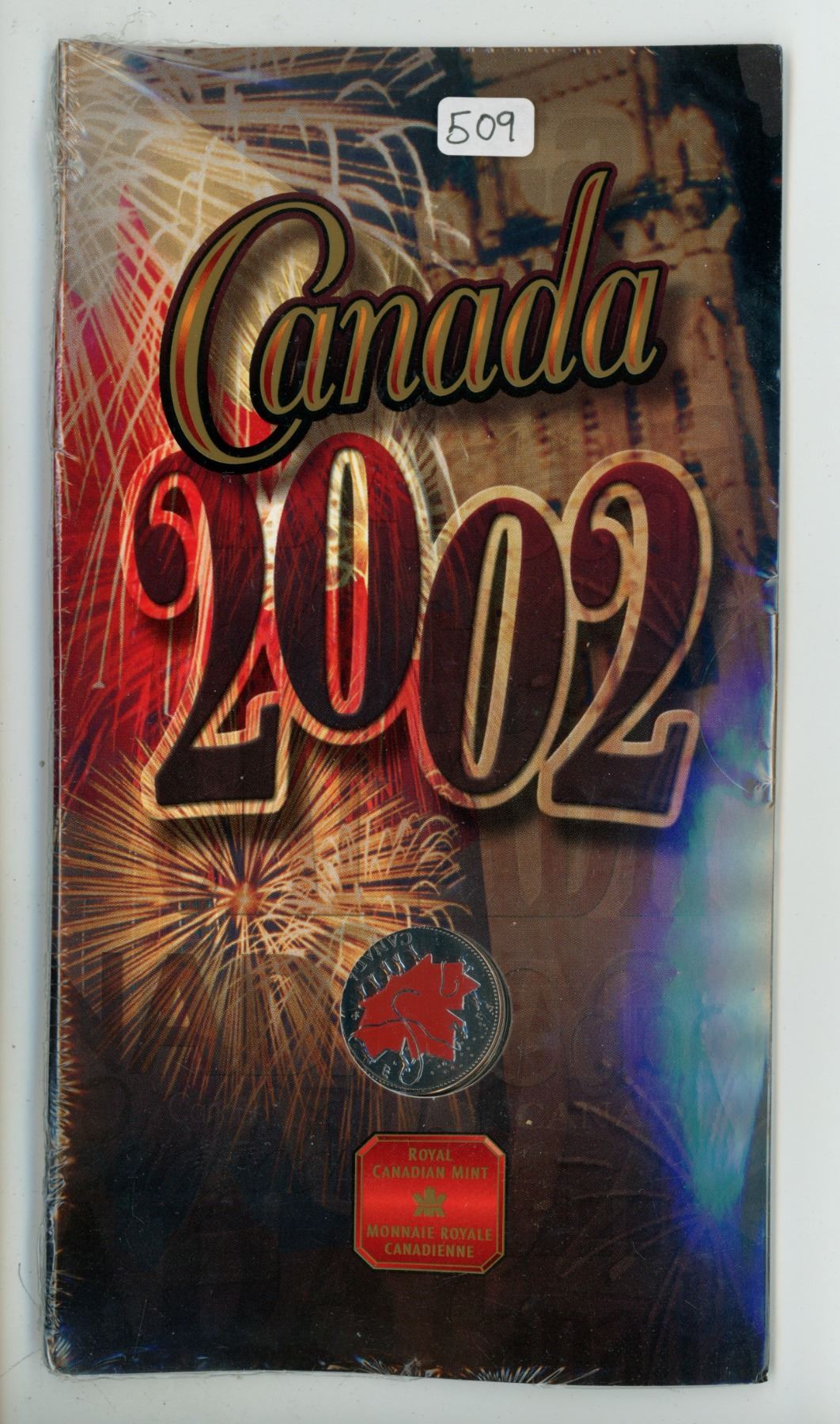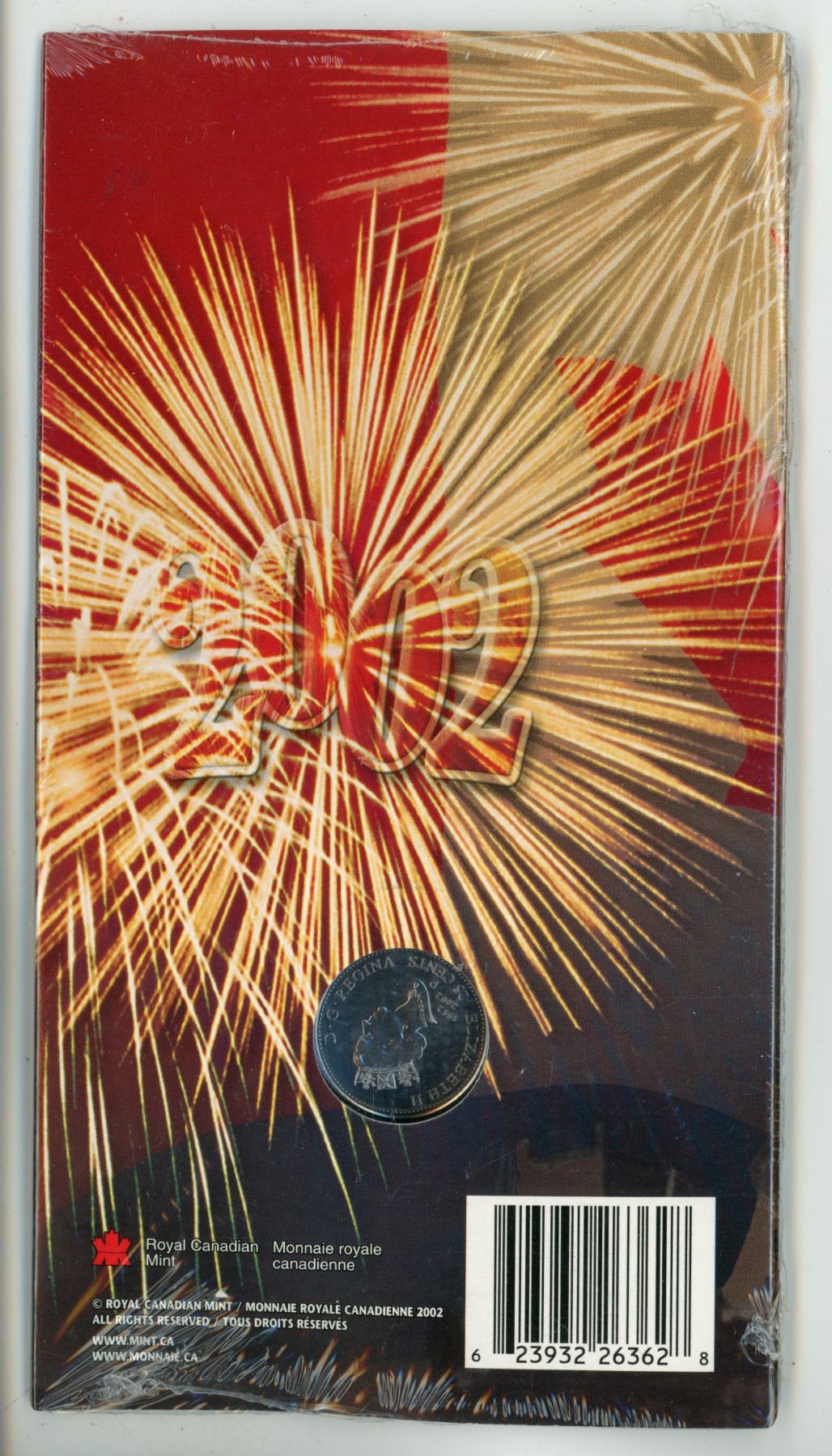 2002P Colourized Canada Day 25 Cents. Painted Colourized map of Canada. Housed in its original unopened Royal Canadian Mint folder of issue.
