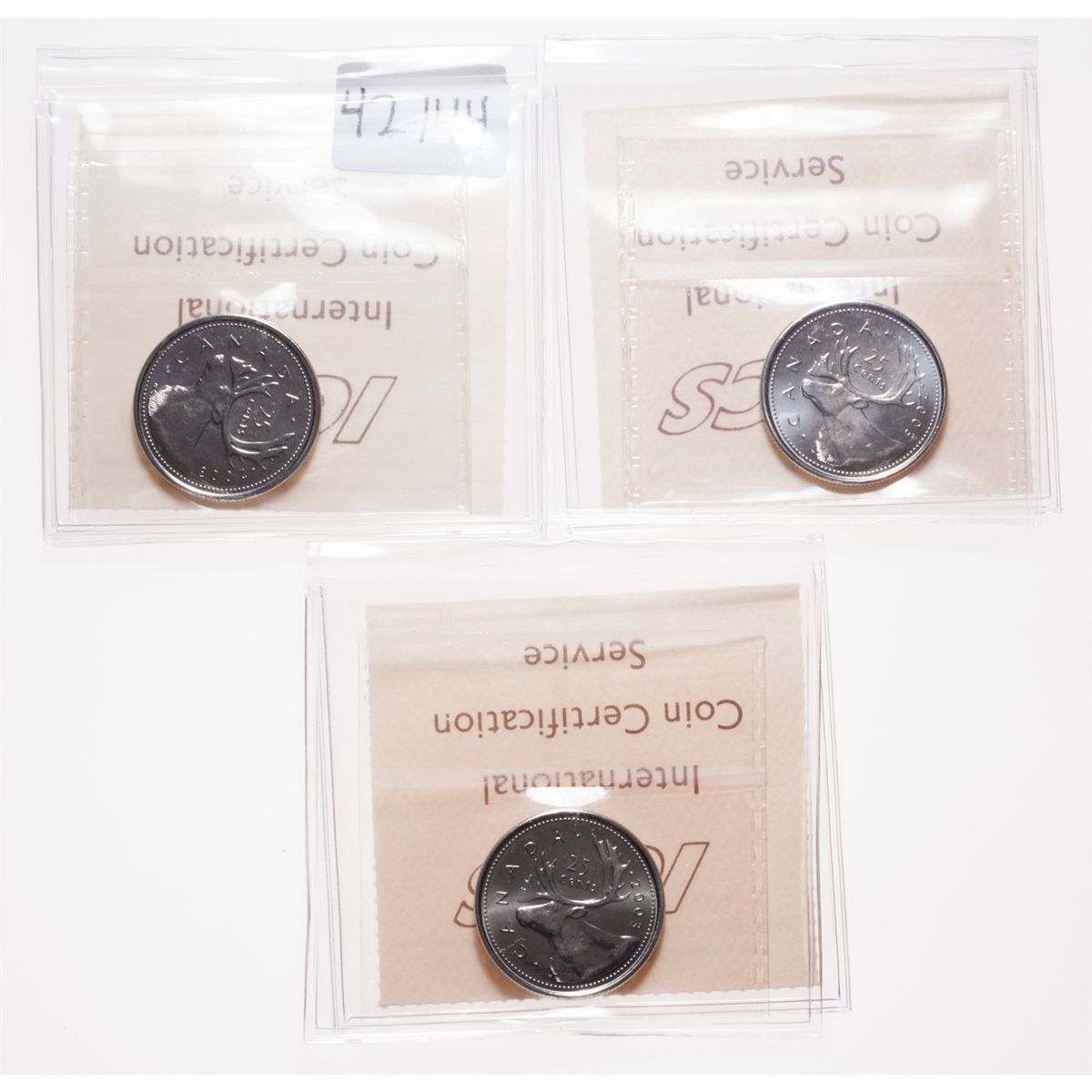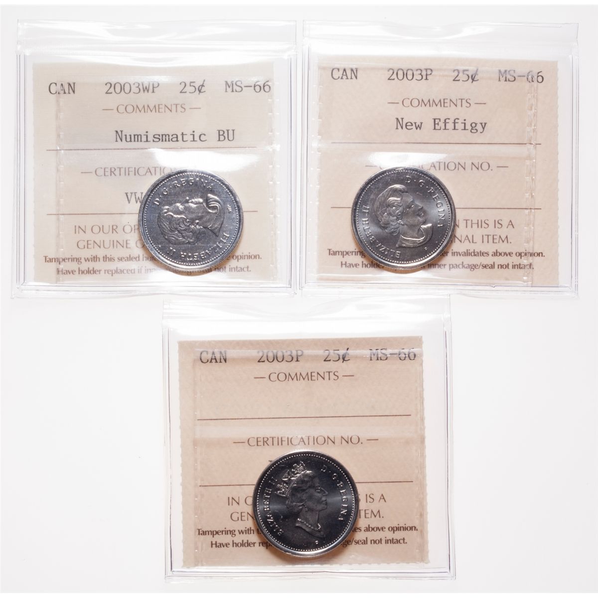 2002P. ICCS Mint State-66. Tied for the second 'Finest' certified by ICCS; 2002P. Canada Day. ICCS Mint State-65; 2003P. ICCS Mint State-66. Tied for the 'Finest' certified by ICCS; 2003P. New Effigy. ICCS Mint State-66. Tied for the second 'Finest' certified by ICCS; 2003W. ICCS Numismatic BU-66. Lot of five (5) gems.