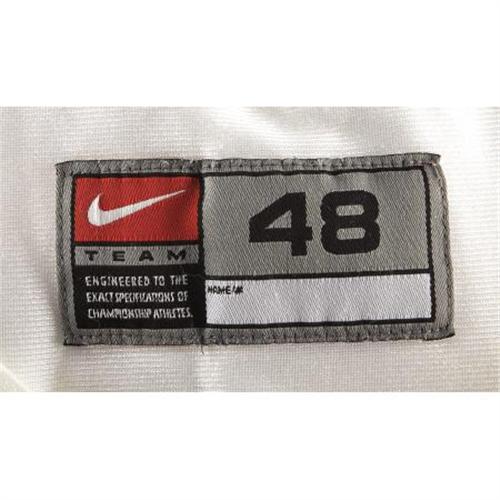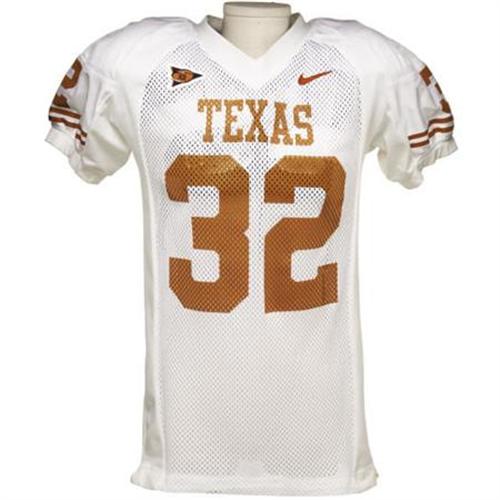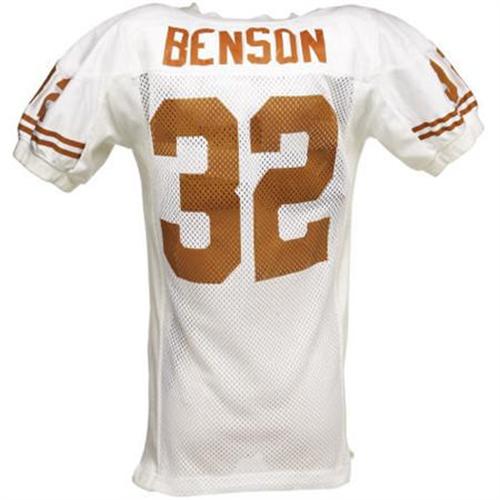 <B>2003-04 Cedric Benson Game Worn Jersey.</B></I> Often compared to Ricky Williams for his running style, college choice and distinctive dreadlocks, Benson finds himself second only to Williams in the University of Texas rushing record books with 5,540 yards over his four seasons of Longhorns service. This classic white mesh gamer shows solid running back wear, with a nice assortment of team repairs criss-crossing the dazzle cloth shoulders. "Texas 32" is properly screened upon the chest, which likewise bears patches of the Big Twelve and Nike logo. "Benson 32" is screened upon verso, with the number "32" repeated upon each sleeve. The jersey features quality customization which further augments its authenticity. First, the side panels are custom hemmed from underarm seam to tail and provide a more snug fit. Secondly, the tail is hemmed to reduce extra length often noticeable in shots of Benson when his shirt tail hangs out. The inner collar has the correct "Nike [size] 48" label. In short, a fine representation from one of the most prolific ball carriers in Longhorns history. <I>LOA from Lou Lampson.</B></I><BR><BR><b>Shipping:</b> Clothing, Costumes & Jerseys (<a target="_blank" href="http://www.heritageauctions.com/common/shipping.php">view shipping information</a>)