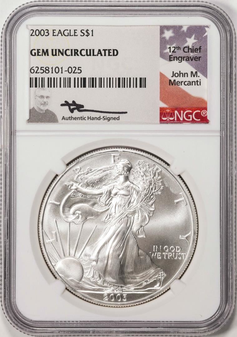 2003 $1 American Silver Eagle Coin NGC Gem Uncirculated Mercanti Signed