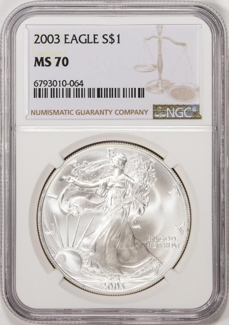 One 2003 $1 American Silver Eagle Coin NGC MS70. NGC Certified.