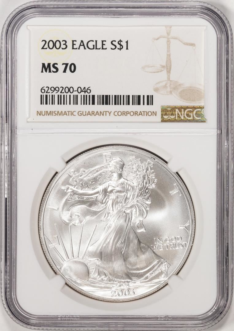 One 2003 $1 American Silver Eagle Coin NGC MS70. NGC Certified.