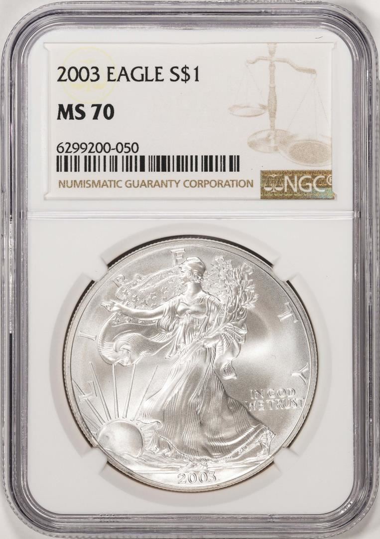 One 2003 $1 American Silver Eagle Coin NGC MS70. NGC Certified.