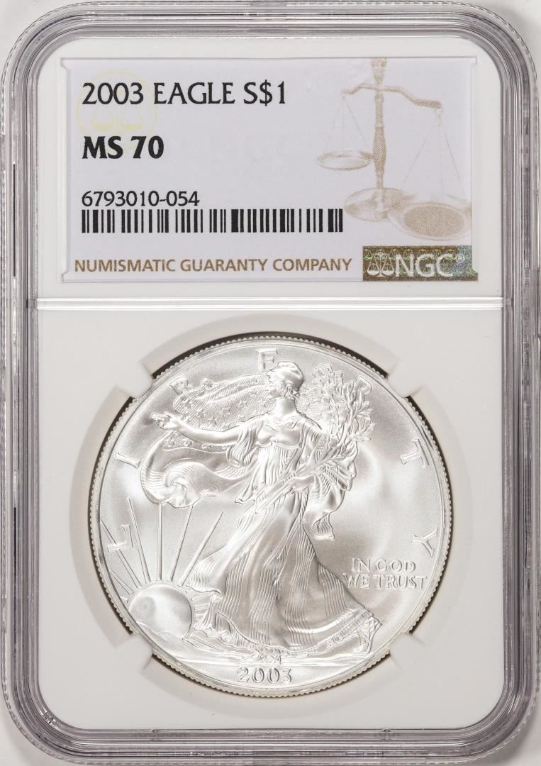 One 2003 $1 American Silver Eagle Coin NGC MS70. NGC Certified.