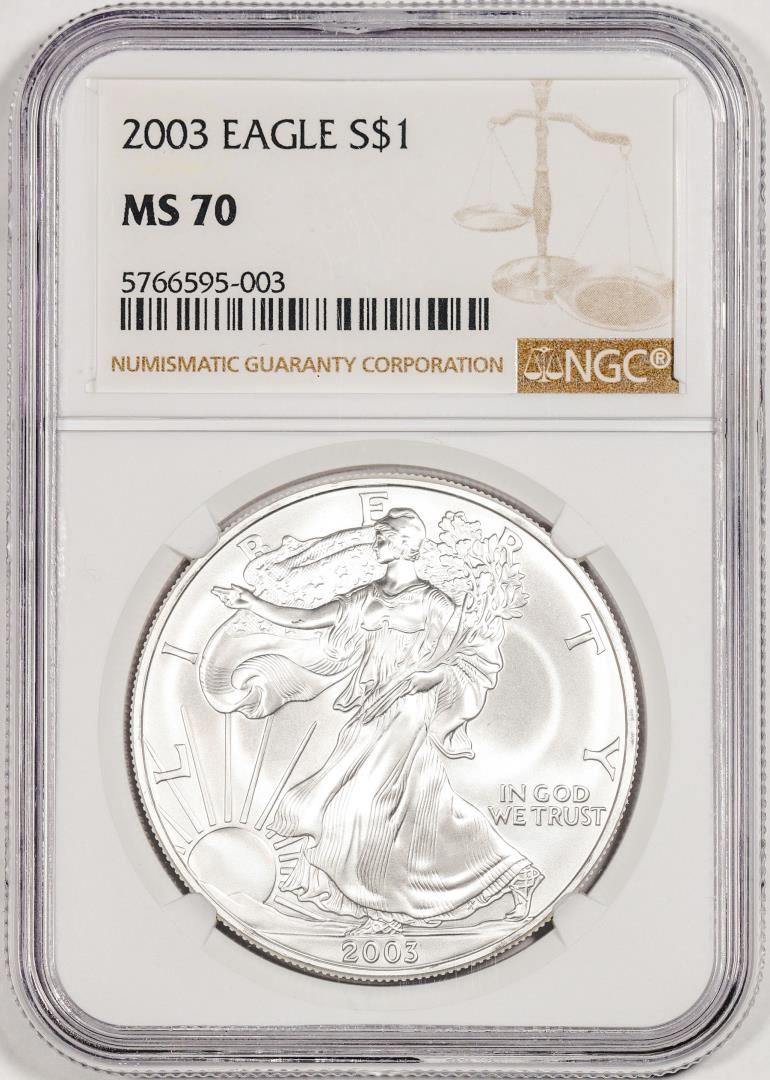 One 2003 $1 American Silver Eagle Coin NGC MS70. NGC Certified.