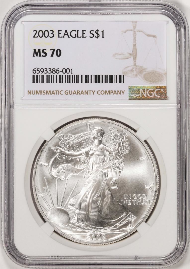 One 2003 $1 American Silver Eagle Coin NGC MS70. NGC Certified.