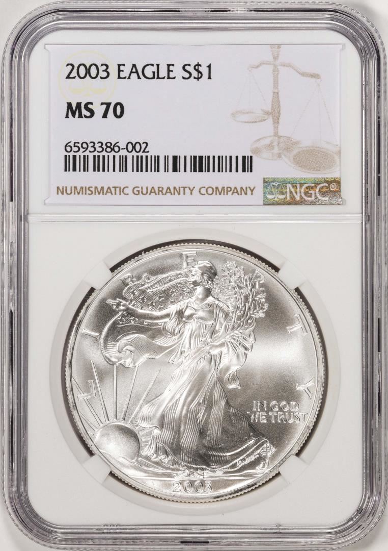One 2003 $1 American Silver Eagle Coin NGC MS70. NGC Certified.