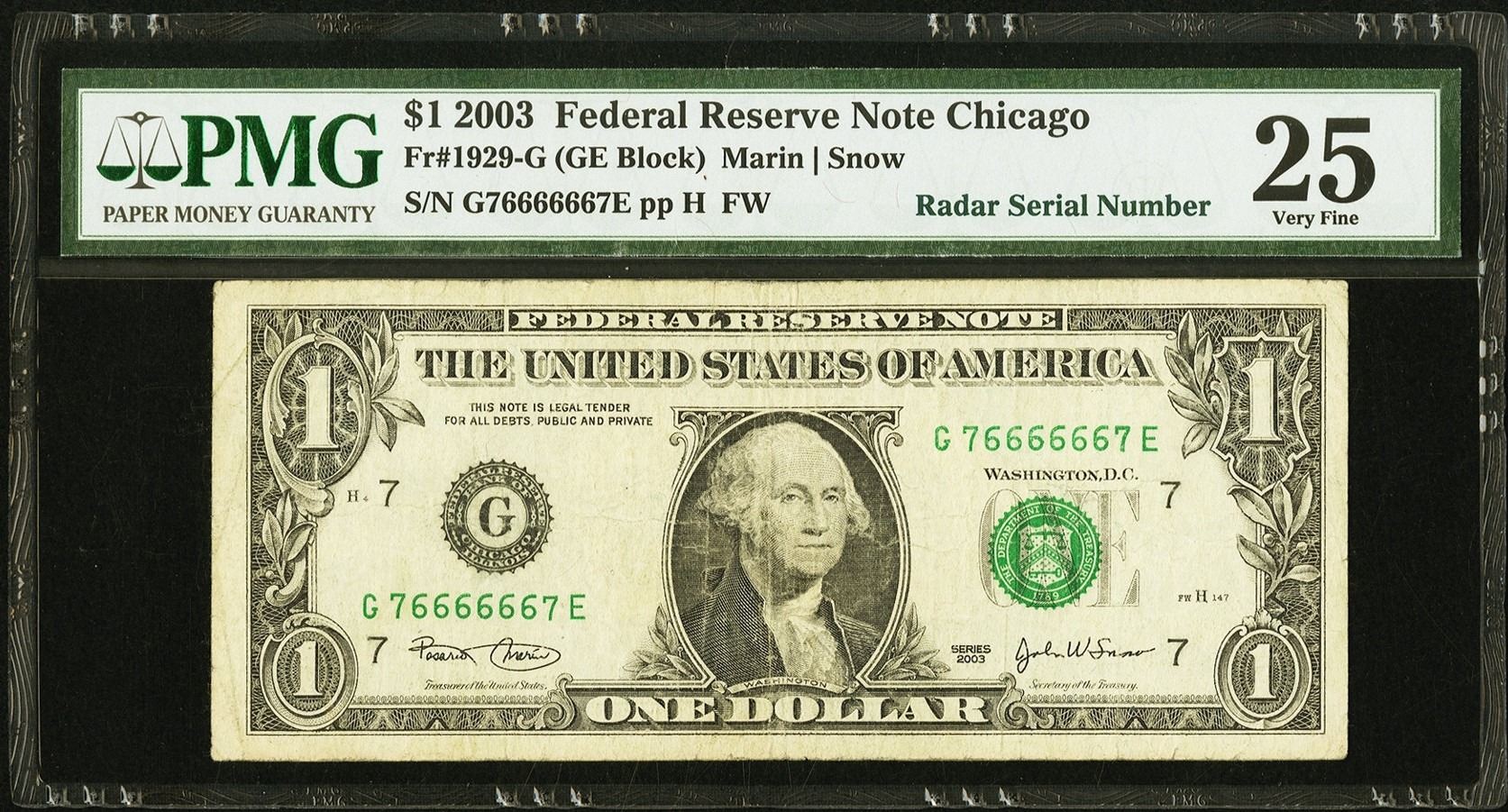 One 2003 $1 Super Radar Serial Federal Reserve Note PMG 25.