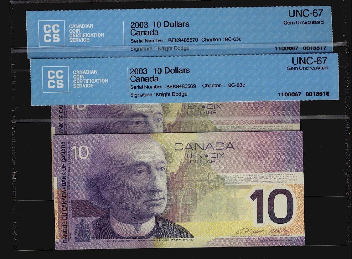 2003 $10 BC-63c #BEK9485569-570 CCCS Gem UNC67. Lot of 2 consecutive notes.