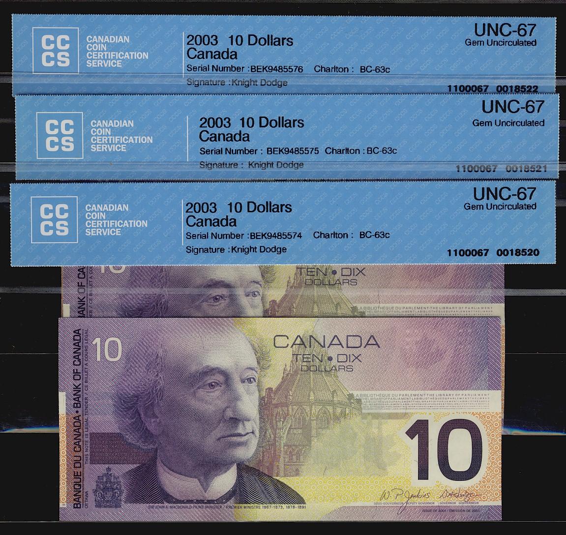 2003 $10 BC-63c #BEK9485576-574 CCCS Gem UNC67. Lot of 3 consecutive notes.