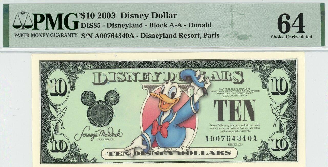 One 2003 $10 Donald Disney Dollar PMG 64.