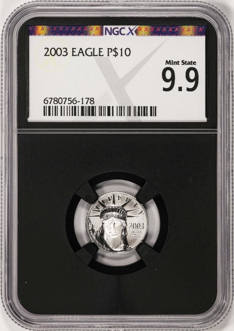 One 2003 $10 Platinum American Eagle Coin NGCX Mint State 9.9. NGCX Certified.