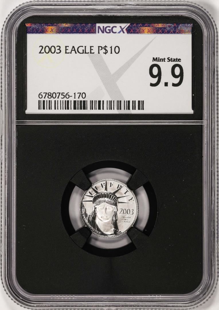 One 2003 $10 Platinum American Eagle Coin NGCX Mint State 9.9. NGCX Certified.