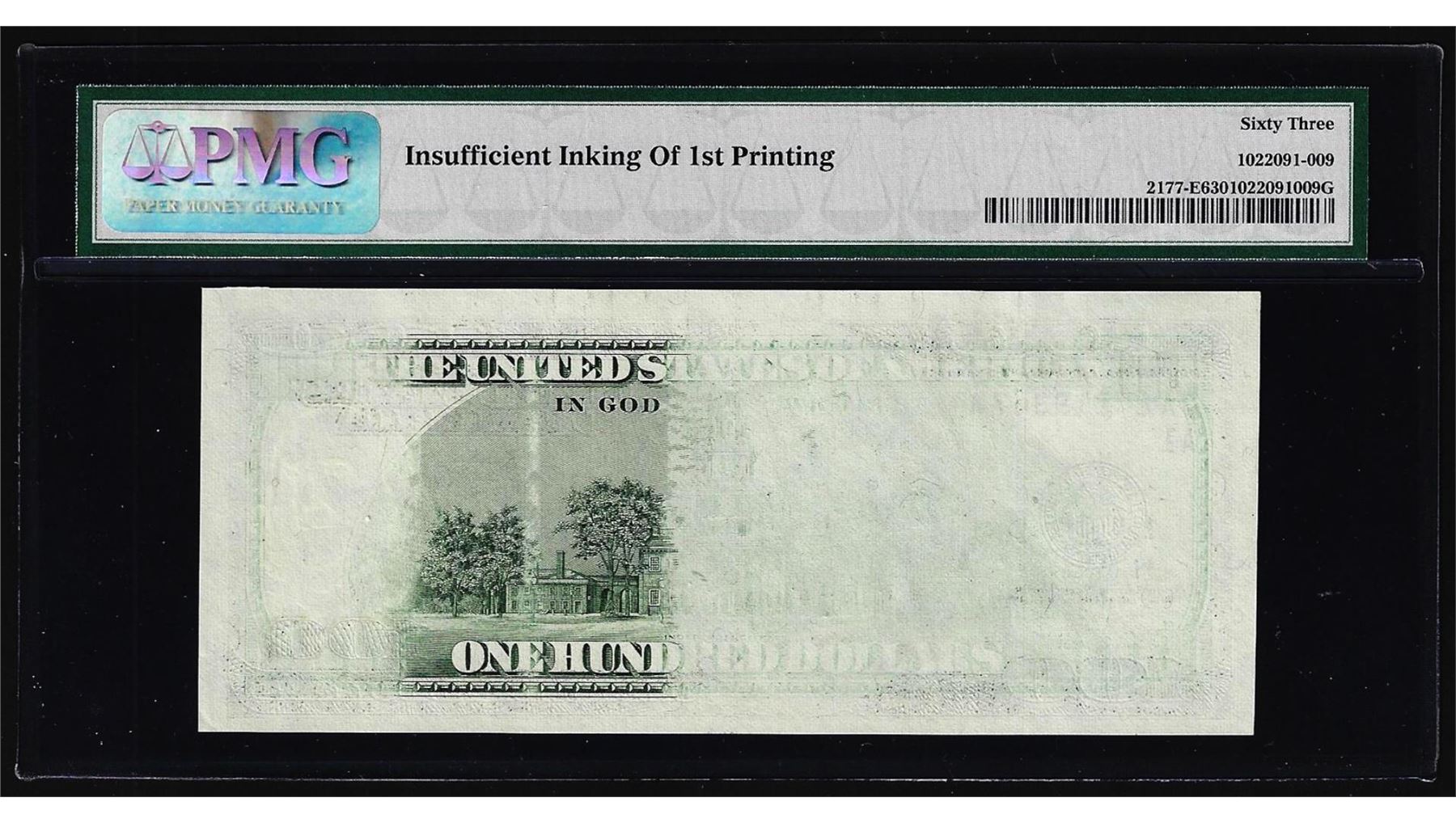 One 2003 $100 Federal Reserve Note Insufficient Inking Error PMG Choice Uncirculated 63. PMG Certified.