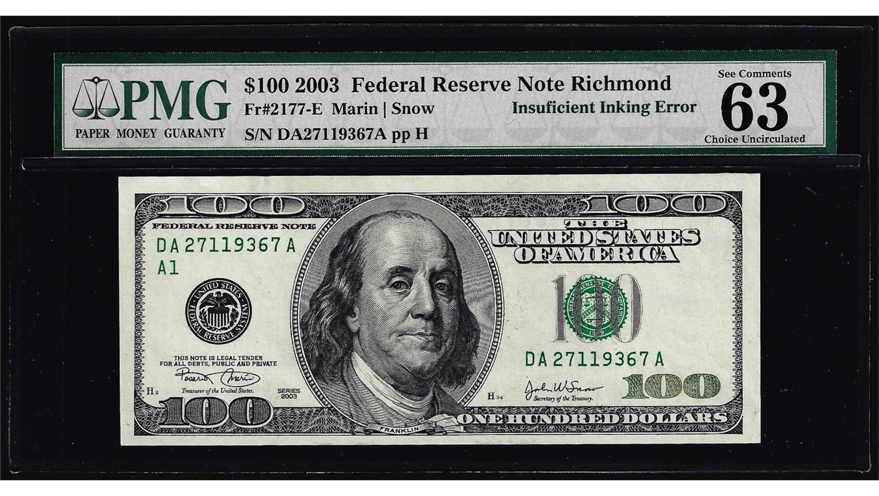 2003 $100 Federal Reserve Note Insufficient Inking Error PMG Choice Uncirculated 63