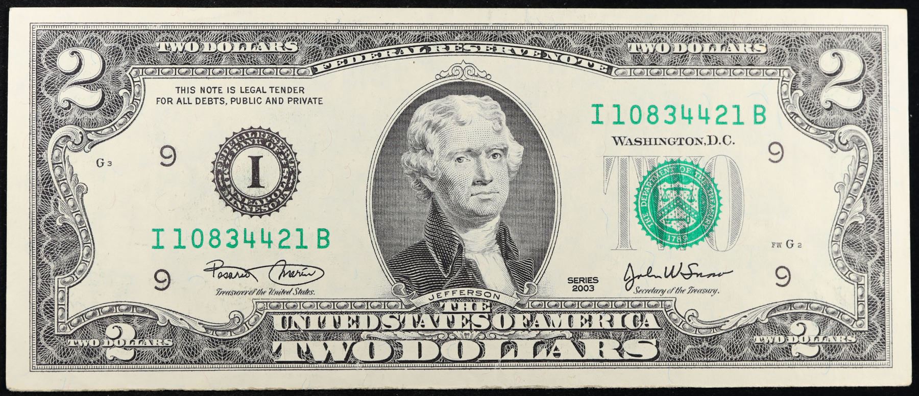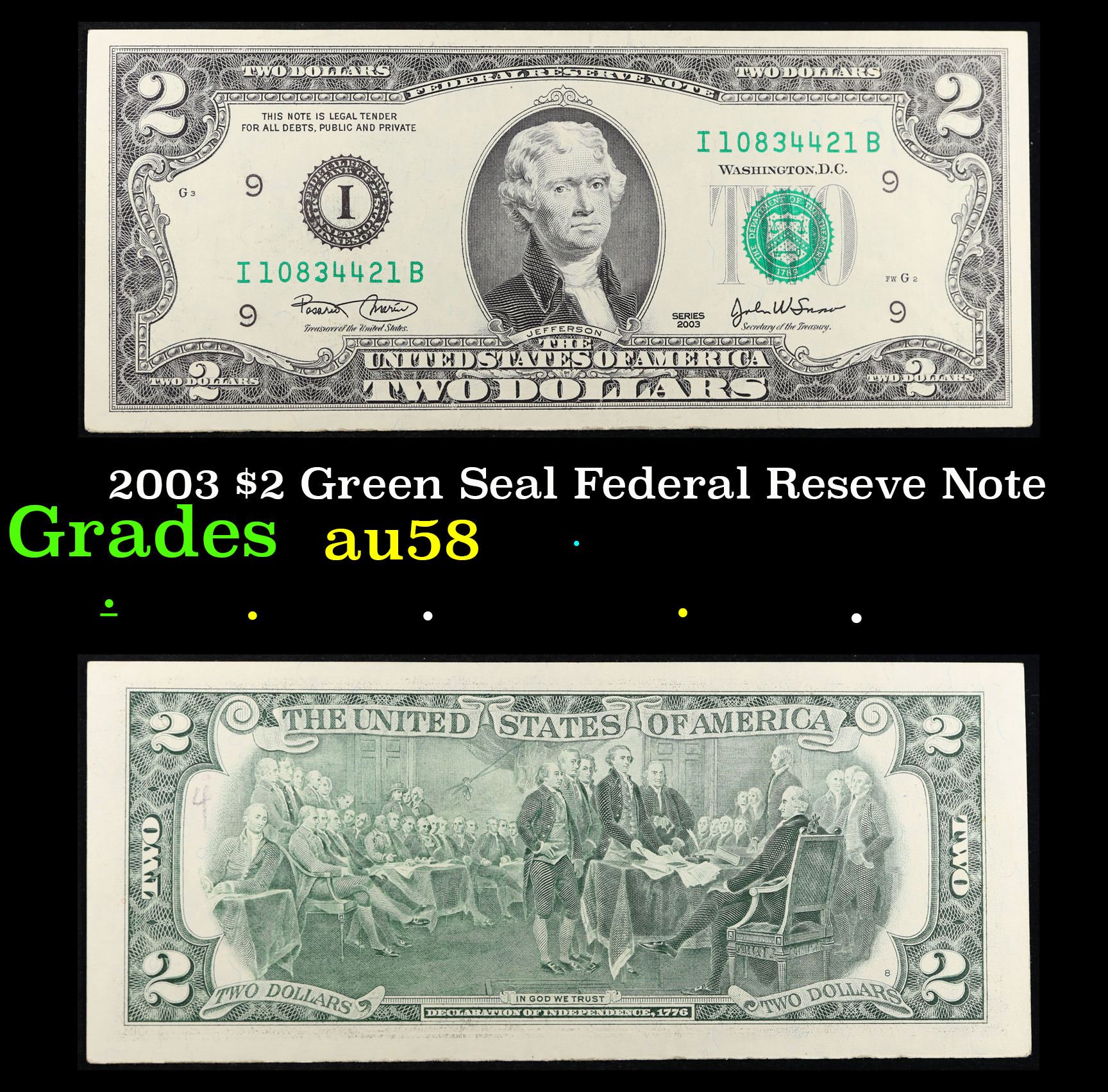 2003 $2 Green Seal Federal Reseve Note Grades Choice AU/BU Slider.